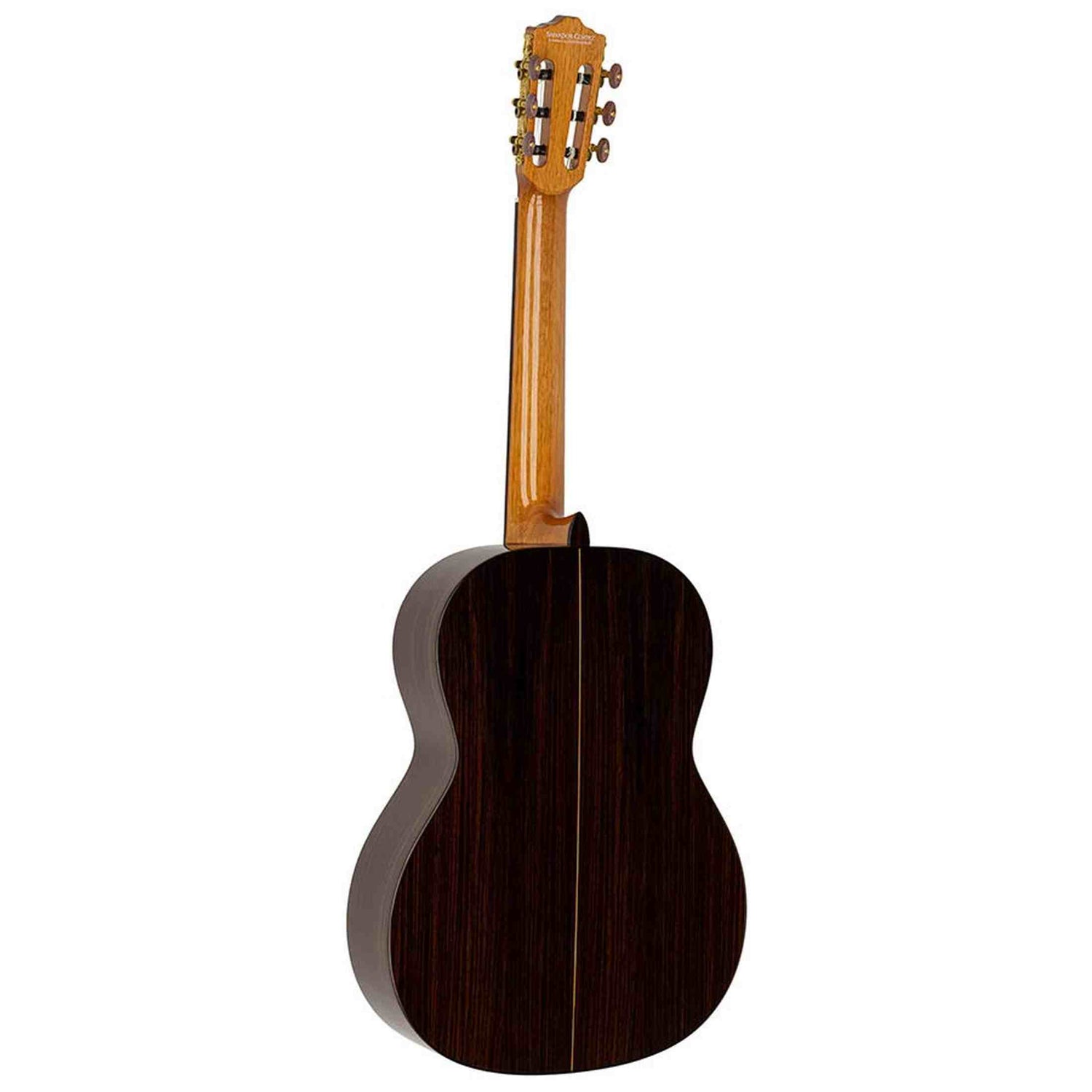 De Salvador Cortez CC-32 is een klassieke gitaar uit de Artist Series, uitgevoerd met een massief Canadees ceder bovenblad en Indisch palissander zij- en achterkant. Deze geliefde houtcombinatie zorgt voor een warm en direct geluid, waarbij het palissander extra volume en helderheid toevoegt. De iets kleinere klankkast geeft de gitaar een verfijnd en licht karakter, zowel in klank als in speelgevoel. Dat maakt de CC-32 bijzonder geschikt voor spelers die een goed klinkend en hanteerbaar instrument zoeken.