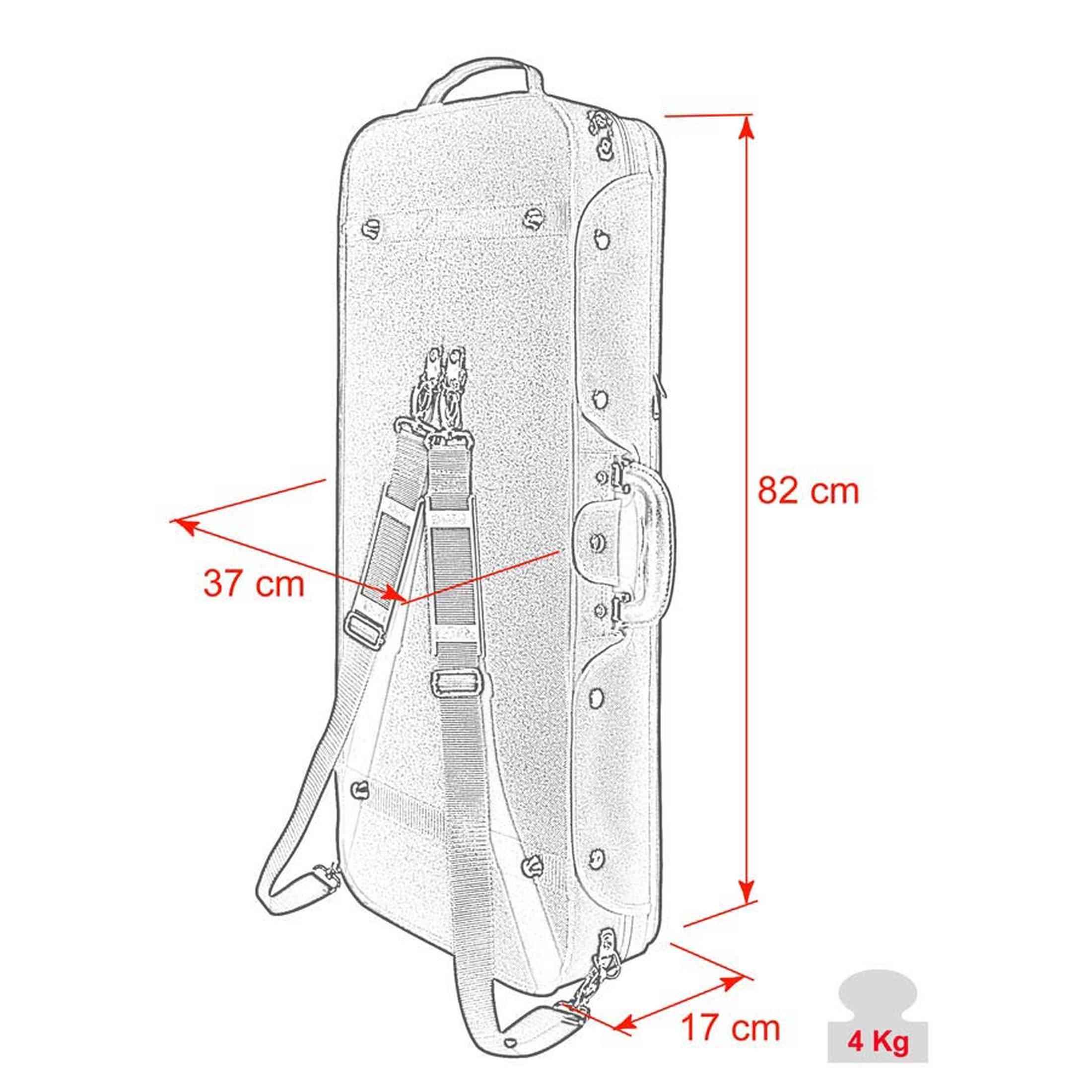 De buitenzijde is uitgevoerd in slijtvast Cordura. De binnenzijde is half gevoerd en afgewerkt met rood suède. Je neemt tot vier strijkstokken mee en bergt accessoires op in twee interne vakken. Met twee rugriemen draag je de koffer comfortabel. De beschermdoek voorkomt direct contact tussen instrumenten en deksel.