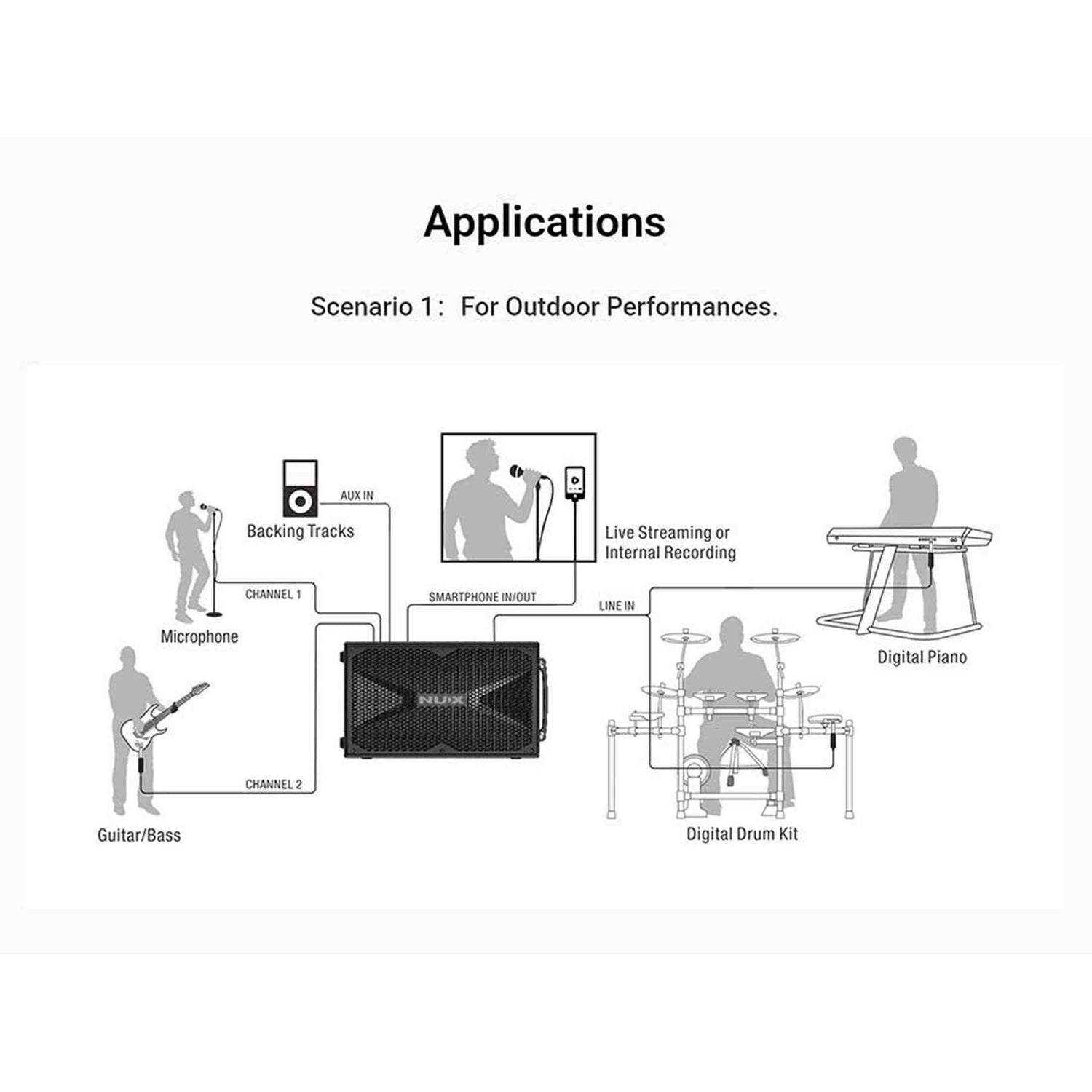 De NUX NBA-200FR is een krachtige, draagbare FRFR-speaker van 200 watt, speciaal gemaakt voor straatoptredens, kleine events en mobiel gebruik. Met een 8" full-range speaker en twee 3" tweeters levert hij helder en gebalanceerd geluid, zonder dat je ingewikkelde instellingen hoeft te doen. Dankzij de ingebouwde 5200 mAh accu speel je tot 6 uur draadloos – ideaal voor buitenoptredens waar geen netstroom beschikbaar is. De Class-D versterker zorgt voor een hoge output met minimale warmte en gewicht.