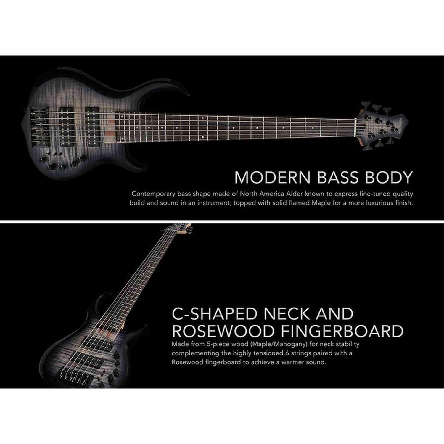 De Sire M7+ A6/TBK is een 6-snarige basgitaar voor bassisten die meer bereik en controle willen. De body van swamp ash met massief flame maple top geeft je een strakke lage B en duidelijke hoge C. De 35 inch mensuur zorgt voor extra snaarspanning en een strakker laag. De moderne bodyvorm hangt goed in balans en speelt comfortabel tijdens lange repetities of optredens.