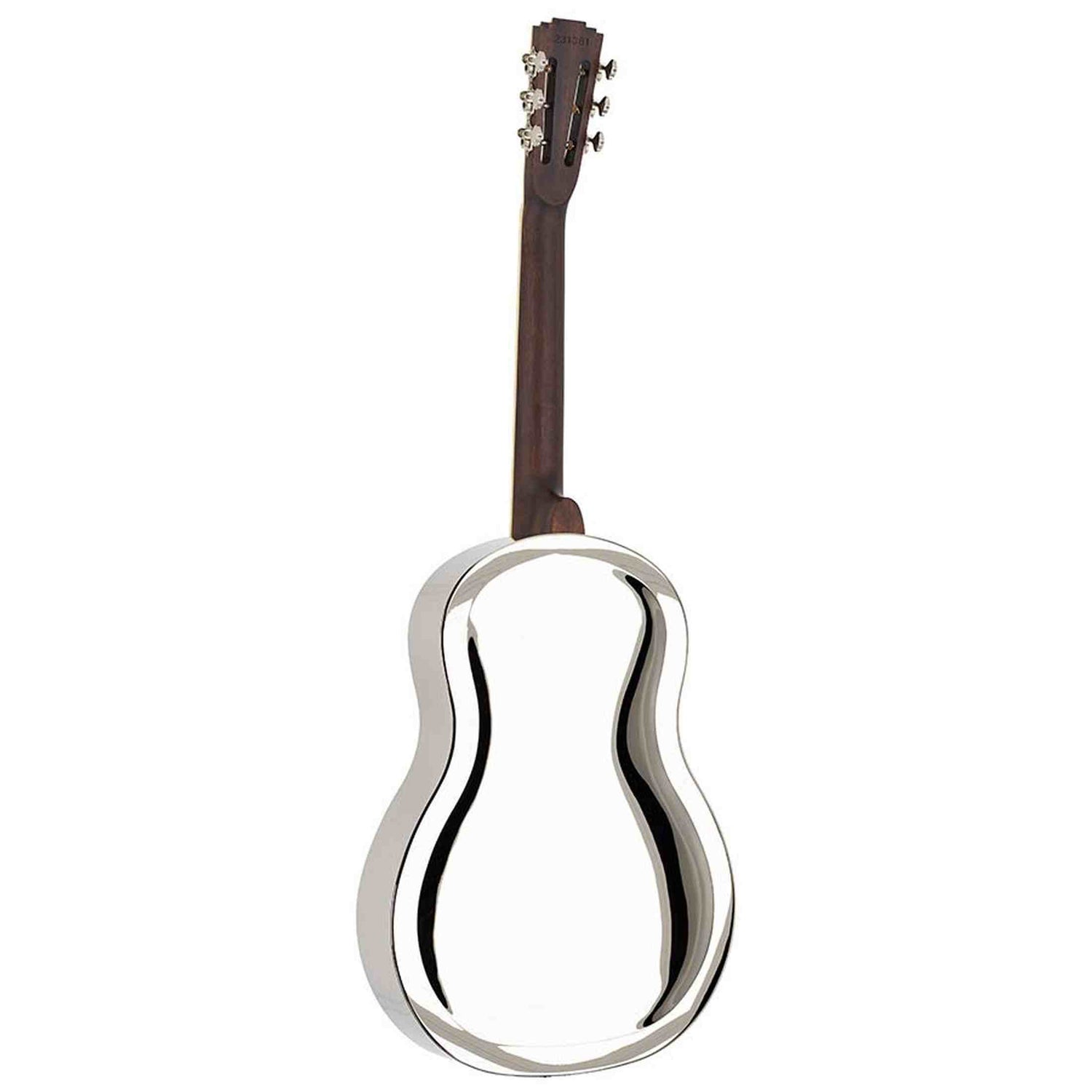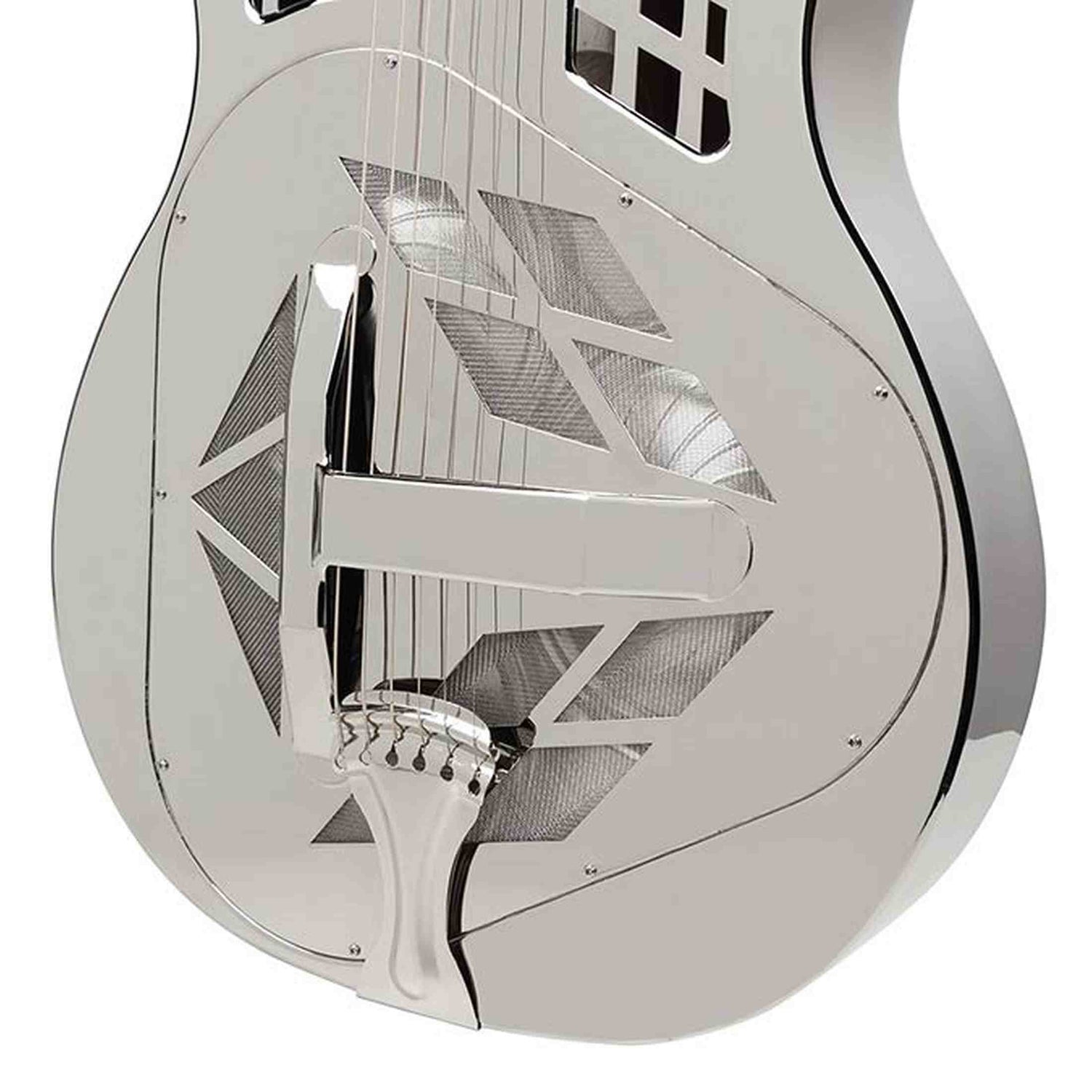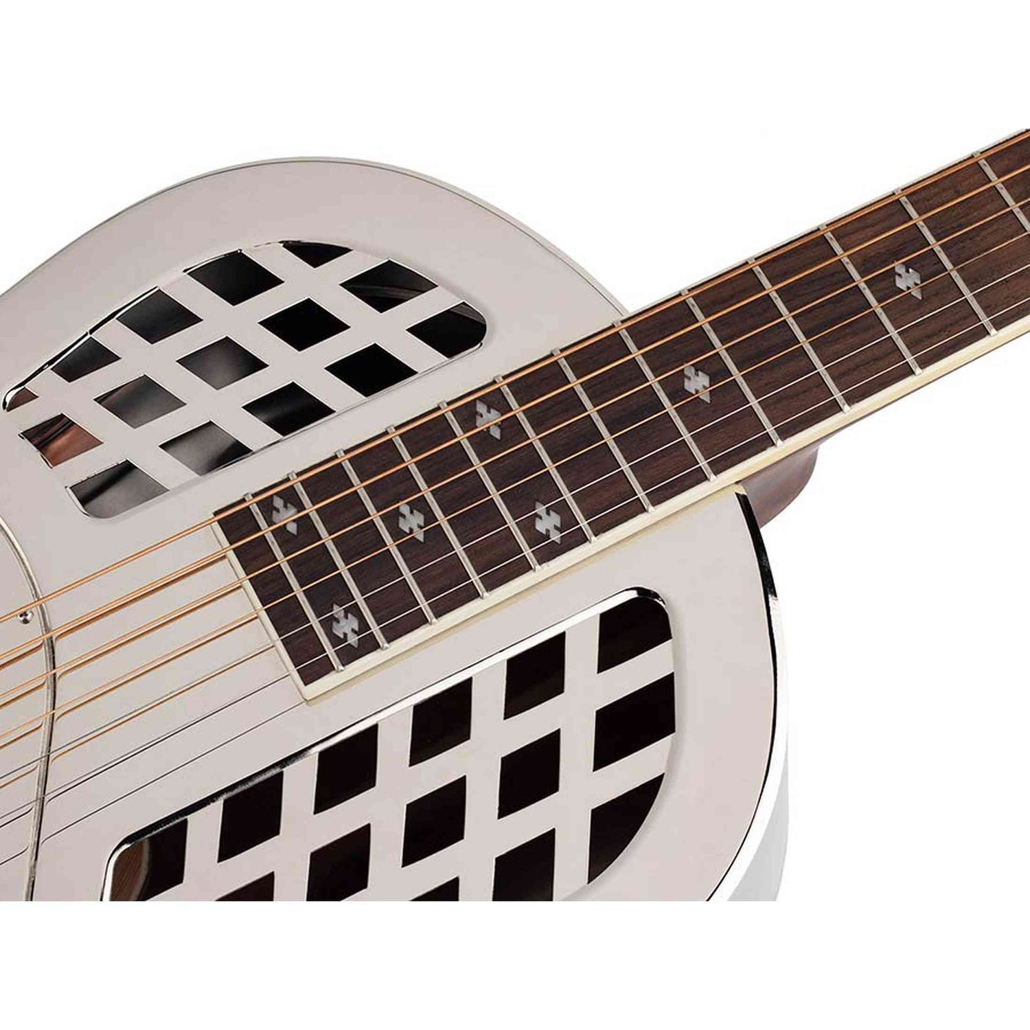 De gepolijste nikkelafwerking en art deco-design maken deze resonator een echte blikvanger. De mahonie hals met satijnen afwerking en 46 mm brede topkam zorgt voor een comfortabele speelervaring, zowel met vingers als slide. Alle Royall resonatoren worden in de werkplaats gebouwd en afgesteld door gitaristen zelf, met handgesponnen resonatorconen van topkwaliteit. De Tampa wordt geleverd met een lichtgewicht softcase voor veilig transport.