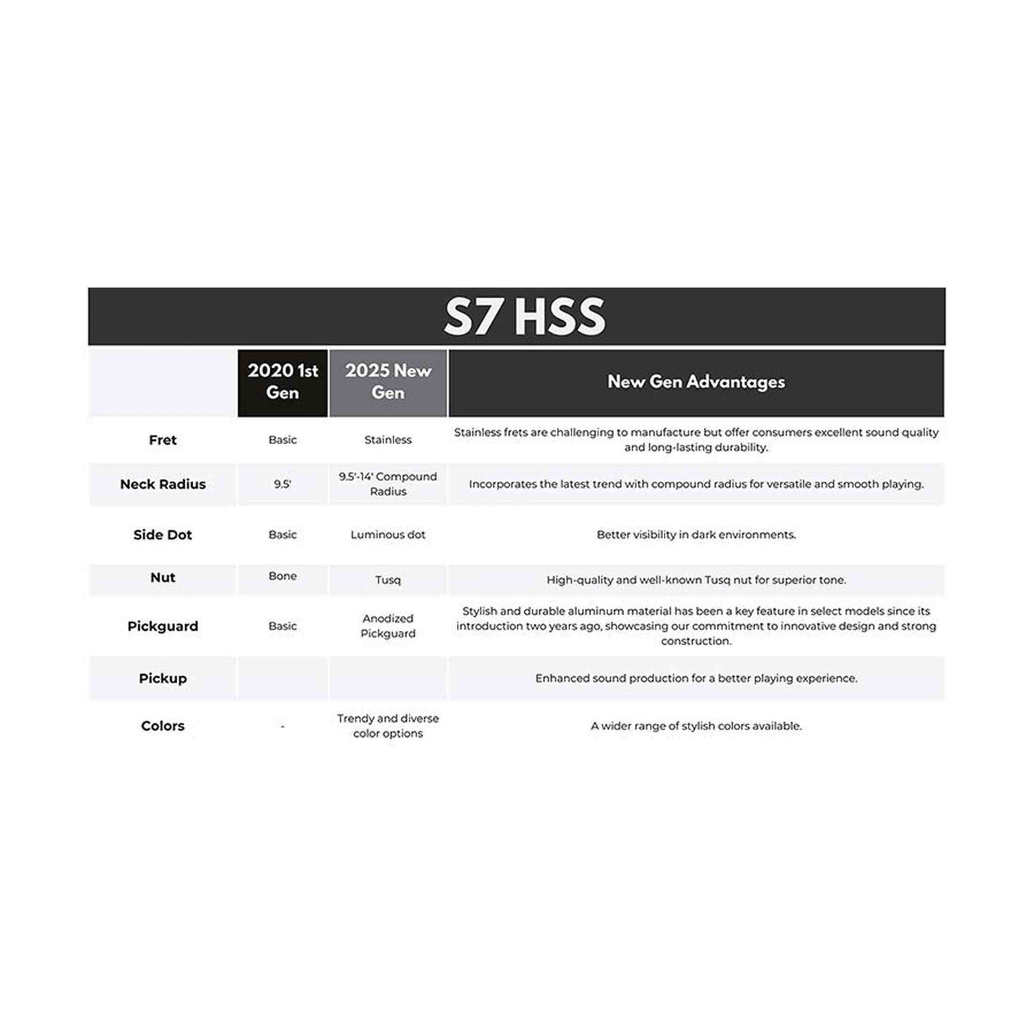 Met de LC HSS pickup set beschik je over een krachtige humbucker voor rijke leadtonen en twee single-coils voor sprankelende cleans. De 5-weg schakelaar biedt moeiteloze toegang tot verschillende klankcombinaties. Extra’s zoals een Graph Tech Tusq topkam, Lumilay side inlays, locking tuners en een 2-post tremolo brug maken dit model compleet. De S7N HSS/SBS is gebouwd voor gitaristen die zich willen onderscheiden – in sound én look.