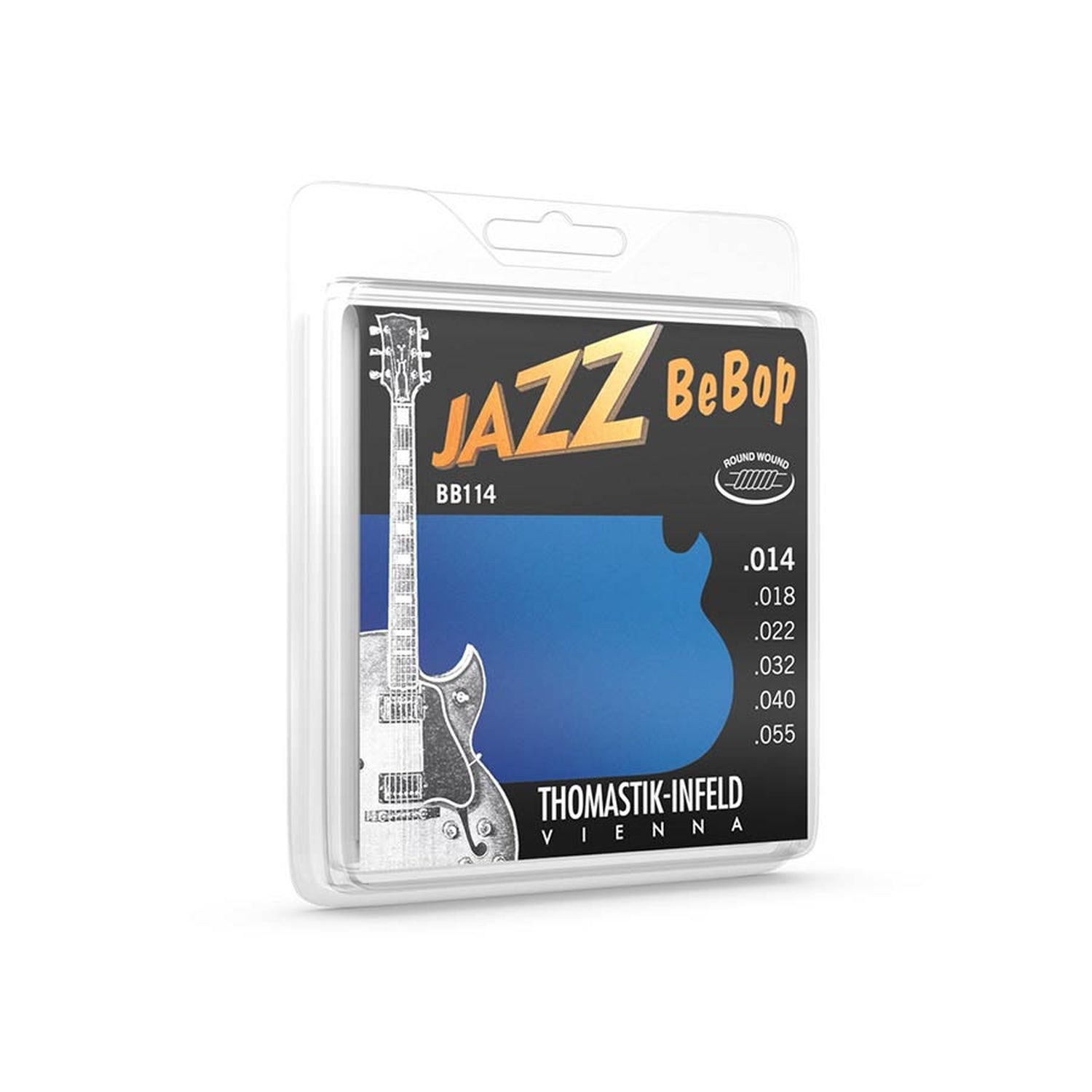 Thomastik Infeld THBB-114 snaren set elektrisch, nickel roundwound, 014-018-022-032-040-055 Probably the only round wound guitar snaar that can truly be called a jazz snaar. A similarity to the JAZZ SWING in materials and snaar architecture, but with a small gauge round wound nickel winding, produces a strong, fundamental rich jazzy tone that is somewhat brighter than a flatwound. This remarkable snaar is an excellent alternate choice or the player wanting real jazz tone, but with a bit more of an "edge".