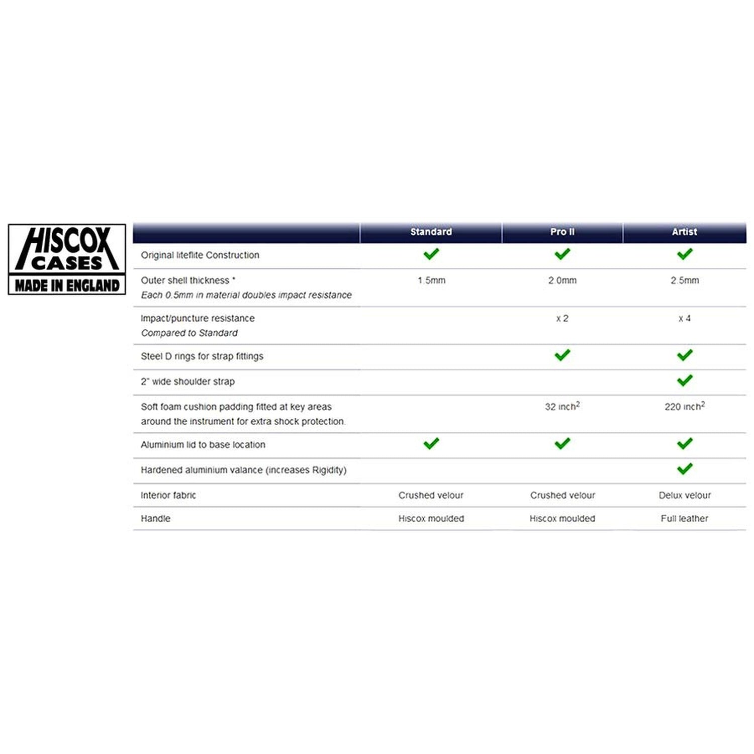 Originele Liteflite constructie. De buitenste laag neemt toe tot nominale 2,0 mm dik. Deze toename van de dikte van deze buitenste laag verdubbelt de impact- / punctuurweerstand van de buitenlaag in verhouding met Hiscox's Liteflite Standard-assortiment. Stalen 'D' ringen zijn geschikt voor de bevestiging van de draagriem. Zachte schuimkussenvoering is op belangrijke plekken rondom het instrument aangebracht voor extra schokbeveiliging.