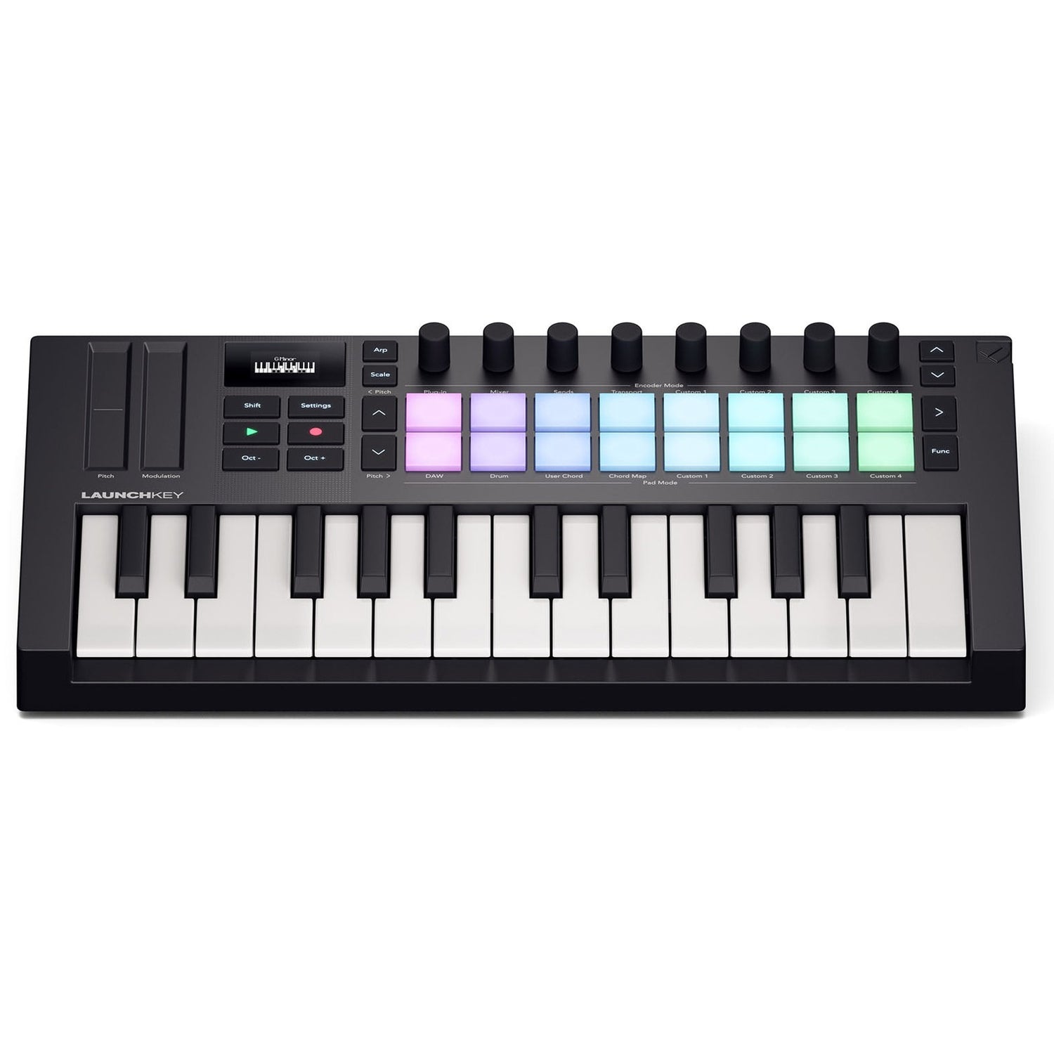 De Novation Launchkey Mini 25 MK4 is een compacte en veelzijdige USB MIDI-controller met 25 aanslaggevoelige toetsen, ontworpen voor muziekmakers die onderweg, thuis of in de studio maximale controle willen in een klein formaat. Deze mini-controller is uitgerust met 16 FSR drumpads met polyfone aftertouch, een helder OLED-display, en touch-strips voor pitch en modulatie. Met functies zoals arpeggiator, Fixed Chord Mode, octaafschakeling, en bedieningsknoppen voor transport (record/play/stop/solo/mute) biedt deze controller verrassend veel creatief gereedschap.