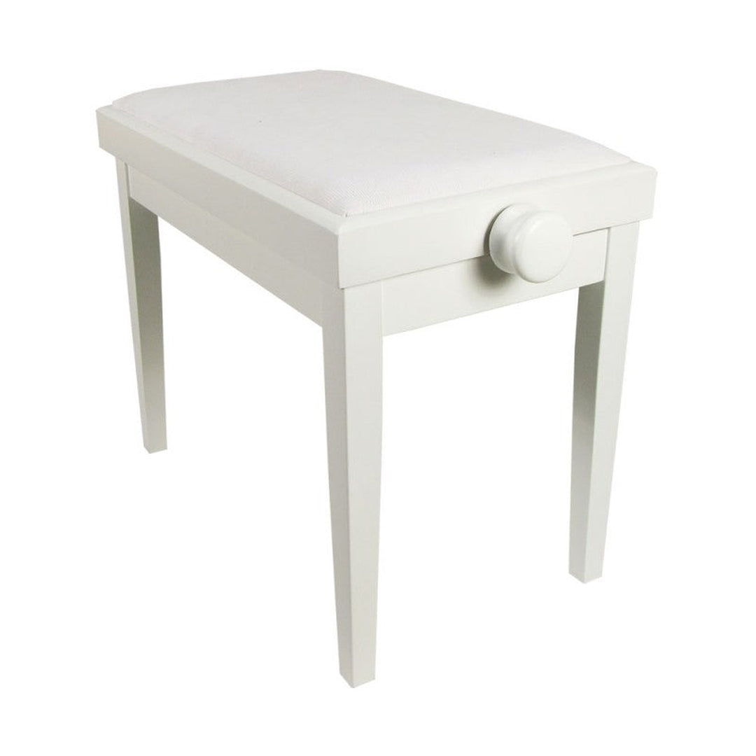 Scarlatti KY102-14W piano kruk wit. De kruk is in hoogte verstelbaar zodat hij aan te passen is tot iedere gewenste zit hoogte. De hoogte is eenvoudig in te stellen via de draai knop aan de zijkant van de piano bank.