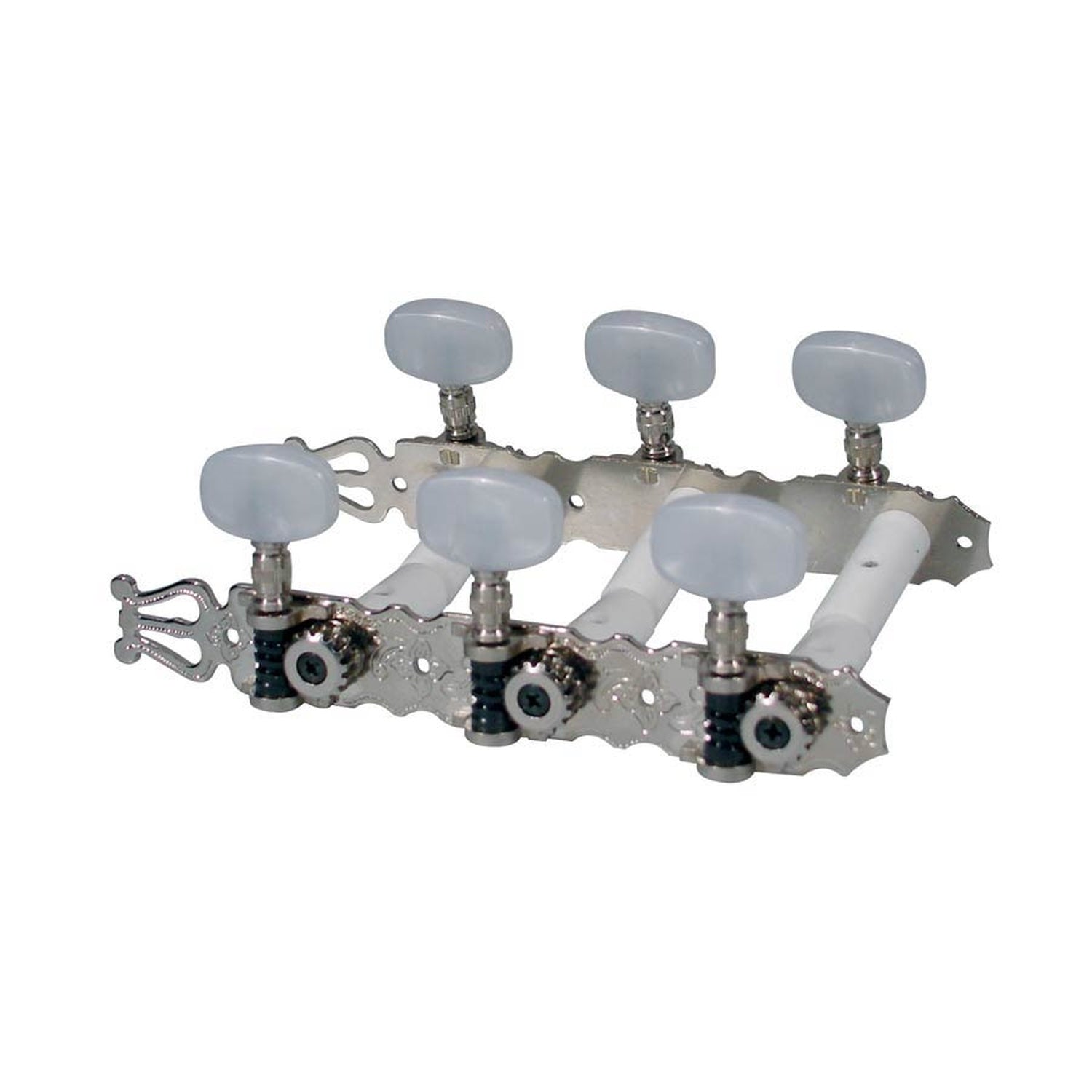 Boston 131 Mechaniken für klassische Gitarre, Nylonschaft, 3x links + 3x rechts, 70mm, Nickel, Perlmuttknöpfe. Boston 131 Mechaniken für klassische Gitarre, Nylonschaft, 3x links + 3x rechts, 70mm, Nickel, Perlmuttknöpfe mit Lyra.