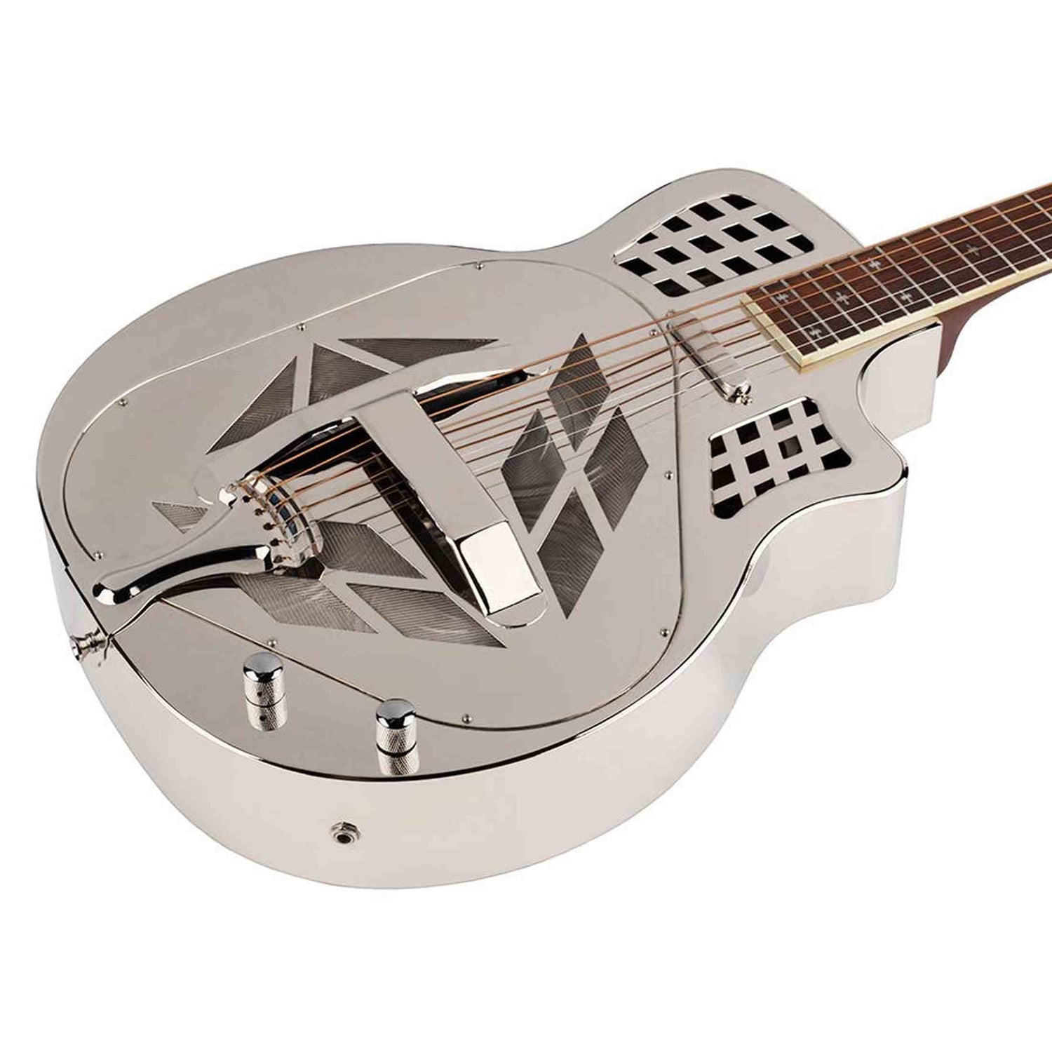 De Royall TMP14CSC/NI Tampa Cut SC is een 14-fret tricone resonator met cutaway en ingebouwde lipstick pickup. De bell-brass body met gepolijste nikkelafwerking ziet er strak uit en levert samen met de drie handgesponnen 6" aluminium cones een rijke, gelaagde toon met veel sustain. Tricones klinken minder direct dan single cone modellen, maar bieden juist meer diepte en klankcomplexiteit – perfect voor fingerstyle en slide in zowel studio als live situaties.