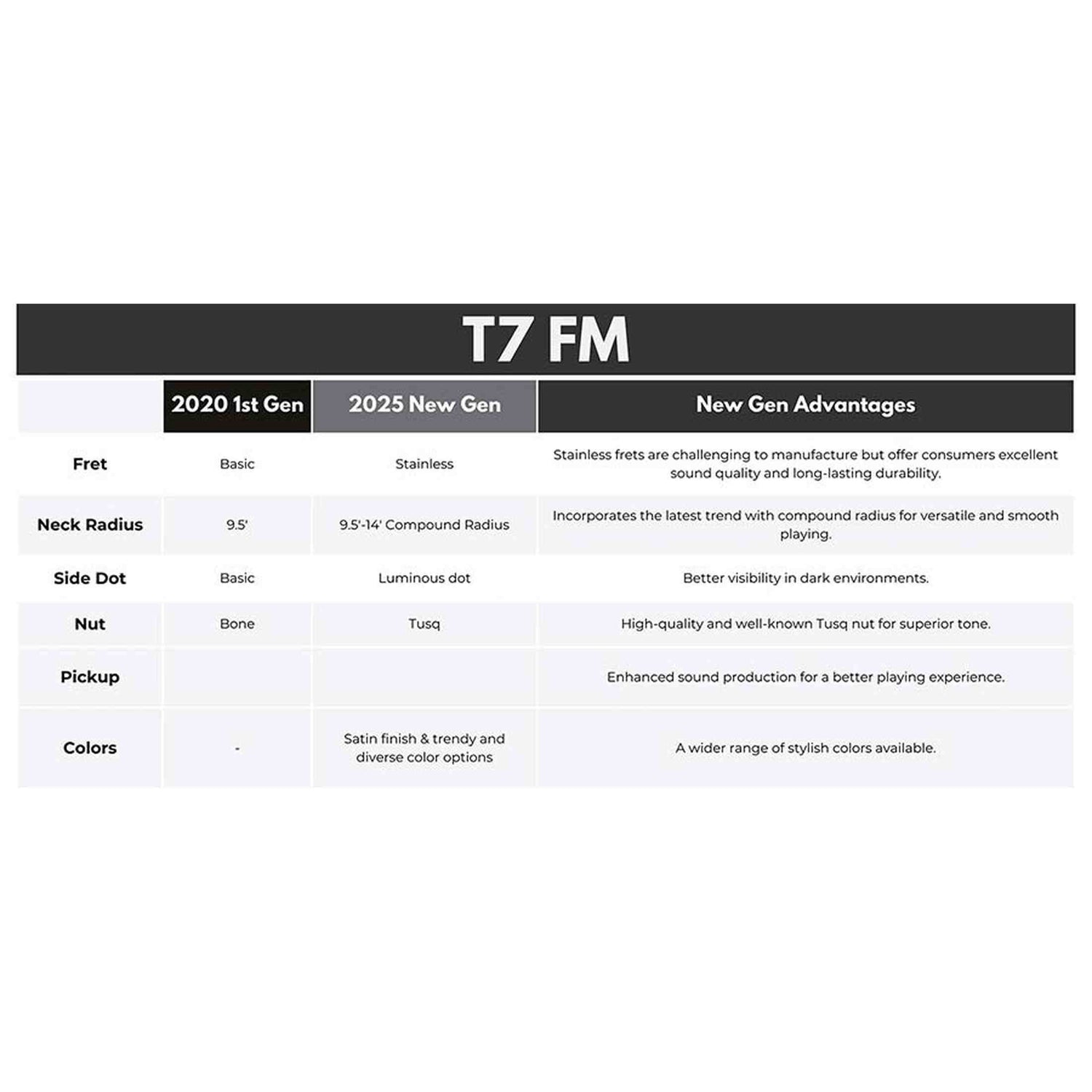 Die LC Super-Modern Zebra Pickups mit Alnico V liefern einen kraftvollen, verzerrungsfreien Sound mit ausreichend Output für härtere Stile. Der 5-Wege-Schalter ermöglicht den Zugriff auf vielfältige Klangvariationen. Das moderne 2-Punkt-Tremolo, die Metallknöpfe und die Locking-Mechaniken sorgen für Stabilität und Kontrolle. Die T7N FM/NT vereint den klassischen T-Style-Look mit moderner Performance.
