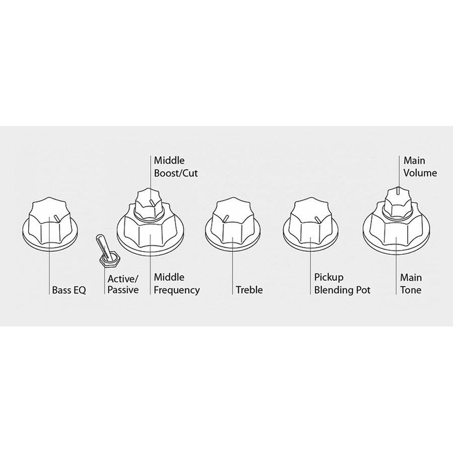 - Regelingen: Volume/tone (dual pot), pickup blender, treble, mid/mid freq (dual pot), bass, mini toggle (actief/passief)