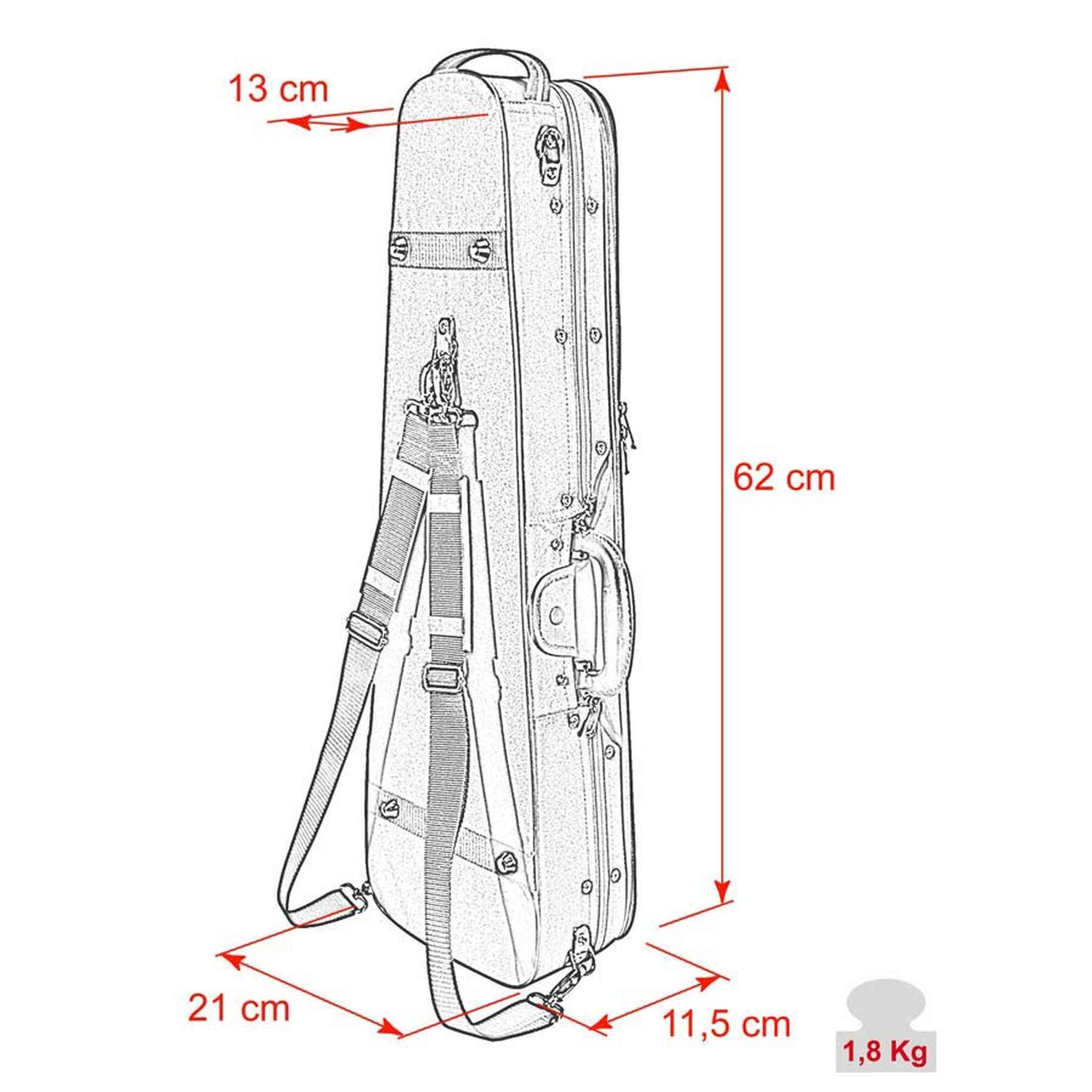 De binnenzijde is volledig gevoerd en afgewerkt met blauw suède. Je neemt twee strijkstokken mee en bergt accessoires op in het interne vak. Het muziekcompartiment biedt ruimte voor bladmuziek. Met twee rugriemen draag je de koffer comfortabel. De beschermdoek voorkomt direct contact tussen viool en deksel.