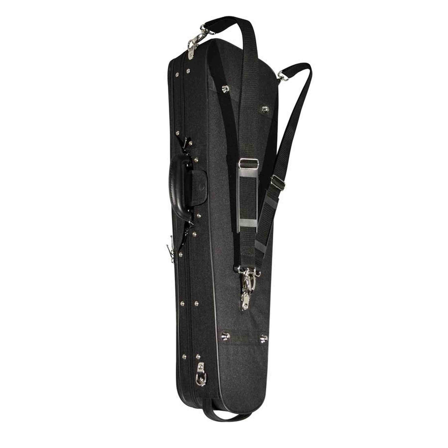De binnenzijde is volledig gevoerd en afgewerkt met blauw suède. Je neemt twee strijkstokken mee en bergt accessoires op in het interne vak. Het muziekcompartiment biedt ruimte voor bladmuziek. Met twee rugriemen draag je de koffer comfortabel. De beschermdoek voorkomt contact tussen viool en deksel.