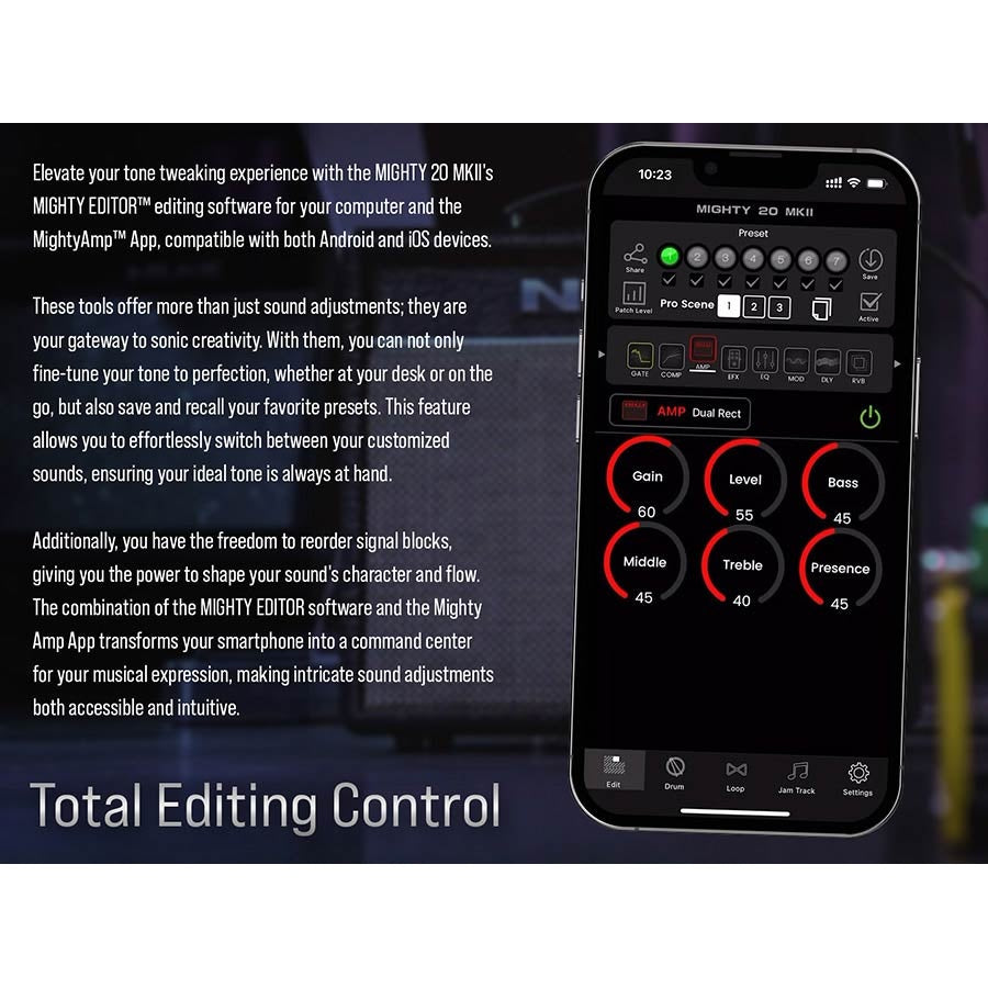 Naast de realistische versterkermodellen biedt de MIGHTY-20MK2 een breed scala aan effecten, waaronder delays, reverbs, compressors en meer. De geïntegreerde 60-seconden looper en drum machine maken hem een creatief hulpmiddel voor zowel oefenen als optreden. De meegeleverde NUX NBT-1 Bluetooth-module biedt draadloze controle via de MightyAmp™ app en audio streaming. Dankzij USB-audio interfacefunctionaliteit, stille oefenopties en compatibiliteit met de MIGHTY EDITOR software, is deze versterker een complete alles-in-één oplossing voor moderne gitaristen.