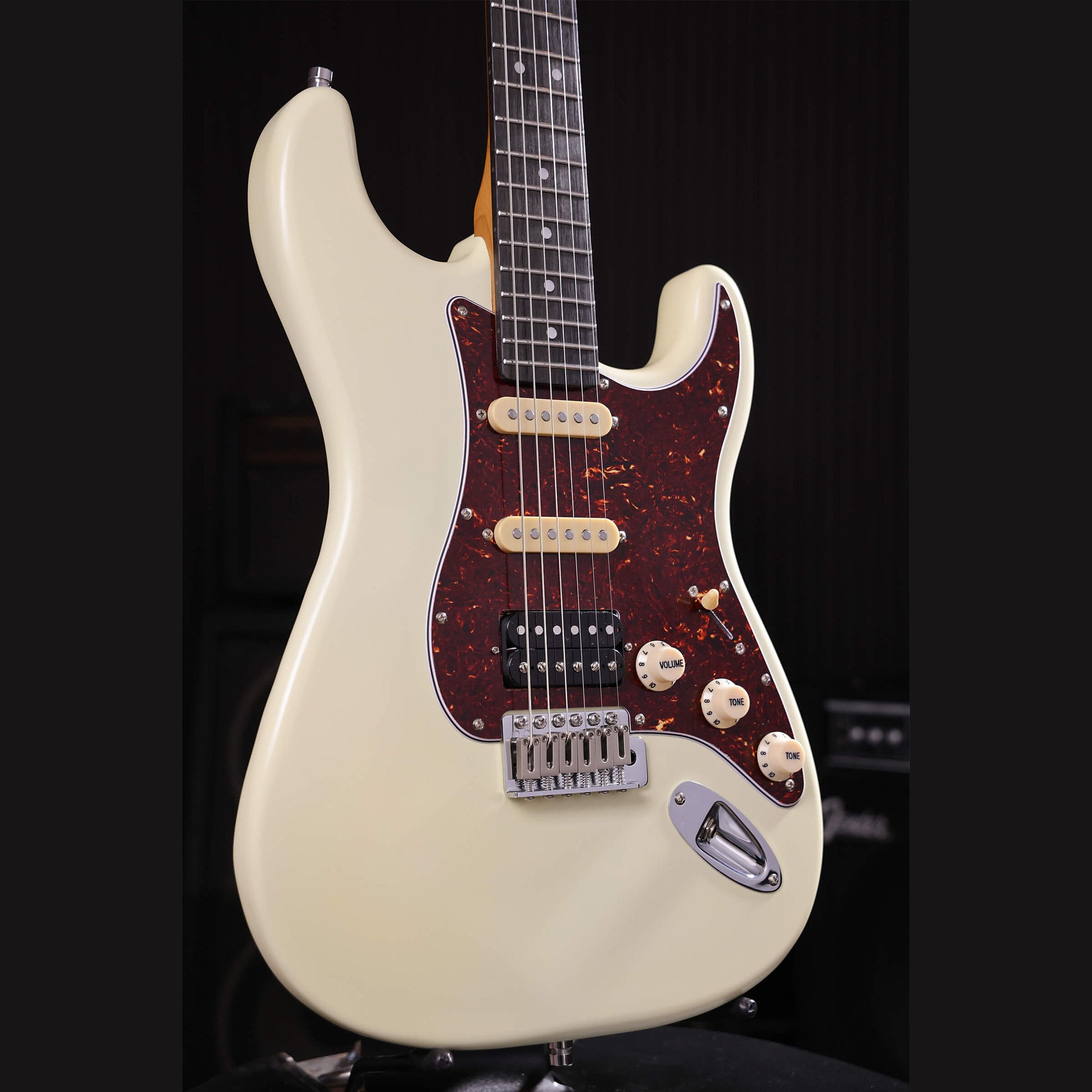 The Patina PS-4 OW is an S-style electric guitar with a HSS pickup configuration that delivers both bright single-coil tones and powerful bridge tones. In the neck and middle positions, you get sparkling cleans and open chords. Switching to the humbucker in the bridge provides more output and a tight response for riffs and solos.