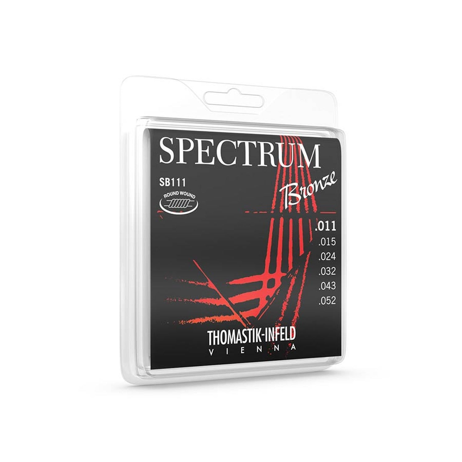 Thomastik Infeld THSB-111 snaren set acoustic, bronze roundwound, 011-015-024-032-043-052 The ultimate bronze round wound acoustic snaar! The SPECTRUM BRONZE snaars are specially designed for the demands of professional recording, yet is also unsurpassed in live performance situations. A unique bronze formula, combined with THOMASTIK-INFELD’s mastery of mechanical filtering with their silk inlay technology, gives a full warm tone, with a sparkling clarity that lets you cut through a dense sound mix. Playing feel is very balanced, and they are surprisingly long lasting.