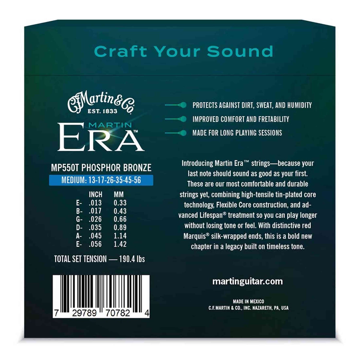 De Martin & Co Era MP550T snarenset combineert moderne technologie met klassieke klank. Deze phosphor bronze snaren zijn behandeld met Lifespan®-coating, waardoor ze langer meegaan en beter bestand zijn tegen corrosie. Dankzij de Flexible Core voelen ze soepeler aan tijdens het spelen, zonder in te leveren op toon of volume. Dit maakt ze geschikt voor gitaristen die veel spelen en een consistente, warme klank willen behouden.
