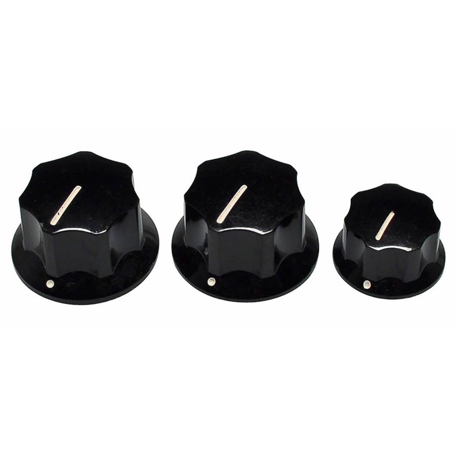Set van drie zwarte controleknoppen voor Fender Jazz Bass en Mustang, ontworpen voor CTS-schalpen. Deze knoppen (volume, volume, toon) zijn voorzien van setscrews en witte indicatorlijnen. Geschikt voor 1/4" split-shaft potentiometers op de meeste in de VS en Mexico gemaakte Jazz Bass-modellen van 1964 tot heden.