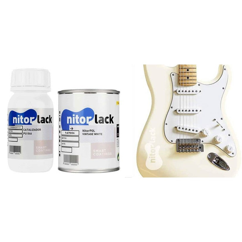 NitorLACK N167006108 is een tweevoudige polyurethaanlak in de kleur Vintage White, geïnspireerd op de klassieke Fender gitaren uit de periode 1960–1974. De kleur heeft een warme, geel-crème ondertoon die het verouderingseffect van oude topcoats nabootst. Deze ondoorzichtige pigmentlak wordt doorgaans aangebracht op een witte basis en wordt het best afgewerkt met een transparante toplaag voor extra bescherming en kleurdiepte.