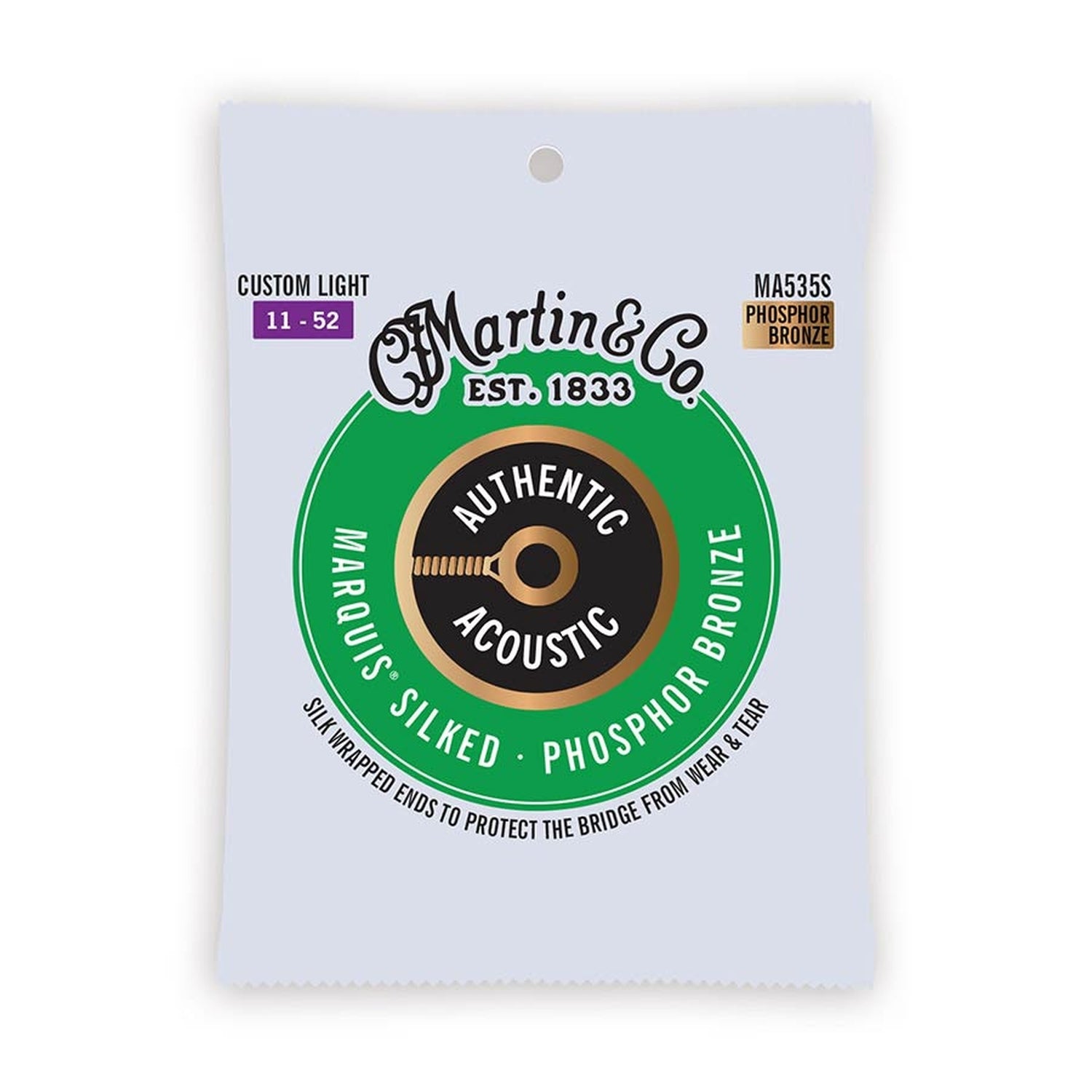 We’ve added a soft silk wrap to the ball ends of our Authentic Acoustic snaars to prevent wear and tear on the bridge and bridge plate as you play. Our silk wrap puts a comforting layer of protection in place every time you change your snaars. Available in 80/20 Bronze and 92/8 Phosphor Bronze. Martin Authentic Acoustic Marquis® Silked snaars offer thread wrapping for bridge protection, corrosion resistance and excellent tuning stability.