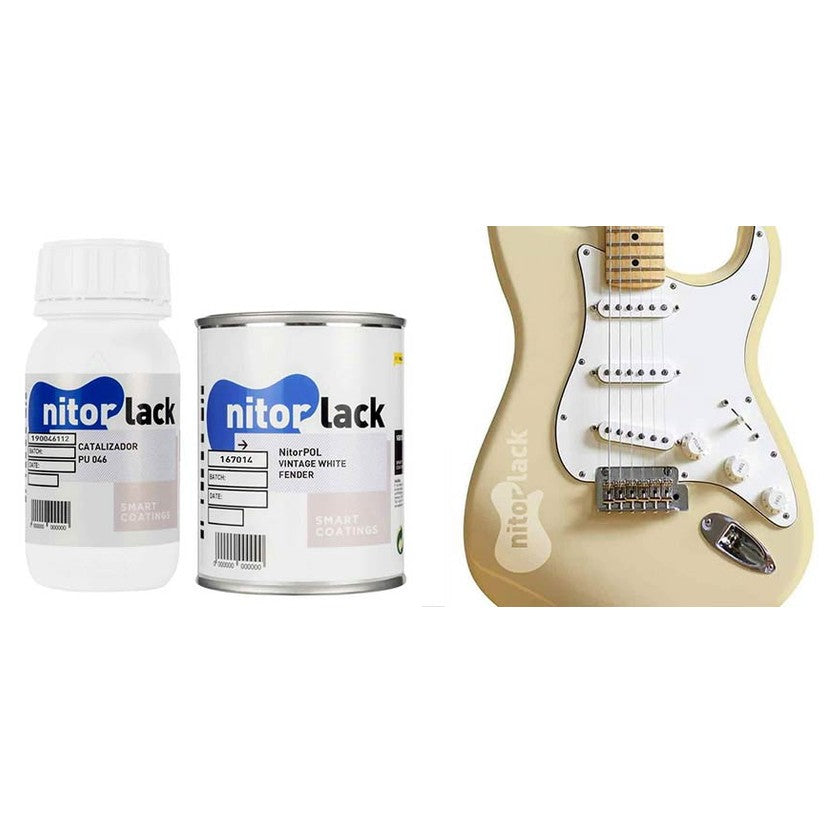 NitorLACK N167014108 is een professionele tweevoudige polyurethaanlak in de kleur Aged Vintage White, geïnspireerd op zwaar verouderde Fender gitaren uit de jaren 1960 tot 1974. Deze kleur heeft een diepe geel-crème toon die het effect simuleert van een sterk vergeelde topcoat door intensief gebruik en veroudering. De ondoorzichtige pigmentlak wordt idealiter aangebracht op een witte basis en afgewerkt met een transparante laklaag voor extra diepte en bescherming.