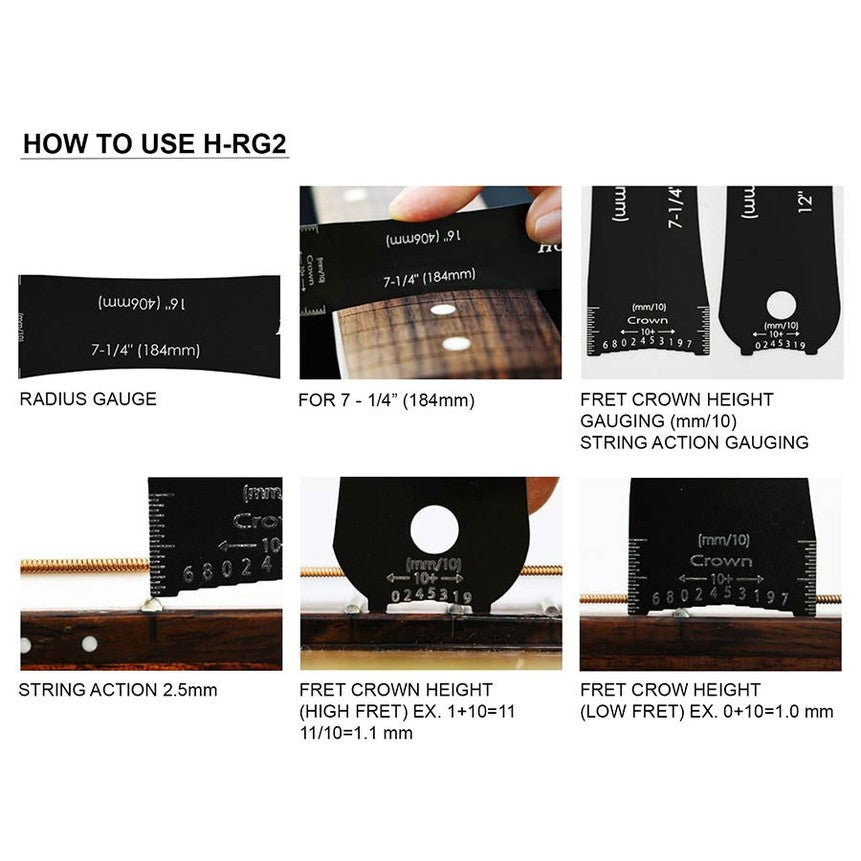 Naast de radiusmeting is het instrument voorzien van een duidelijke schaalverdeling om de snaarhoogte te meten in stappen van 0,2 mm tot maximaal 3,0 mm. De H-RG2 combineert precisie met gebruiksgemak en is een onmisbare tool voor elke gitaarbouwer, technicus of setup-specialist.