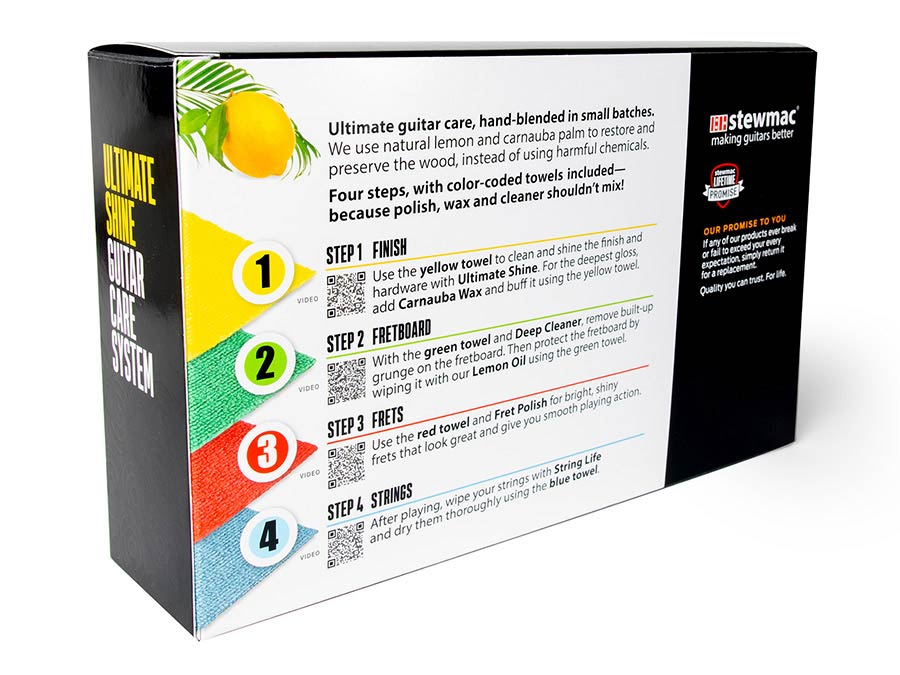Houd al je gitaren schoon, beschermd en in topconditie! Ons Ultimate Shine Guitar Care System wordt met de hand gemengd in kleine batches met echte citroen en carnaubawas om te glanzen en te beschermen zonder schadelijke chemicaliën te gebruiken. De bekwame gitaarbouwer Armand Sentous uit Argentinië ontwikkelde deze mengsels met natuurlijke ingrediënten, destilleerde en bottelde ze in zijn eigen werkplaats om de kwaliteit te krijgen die hij eiste. We hebben ze getest en werden net zo enthousiast als Armand's klanten! Vergeleken met wat je in muziekwinkels vindt, zijn dit ambachtelijke producten van boetiekkwaliteit. In samenwerking met Armand zijn we verheugd je dit uitstekende complete gitaarsysteem te kunnen aanbieden.