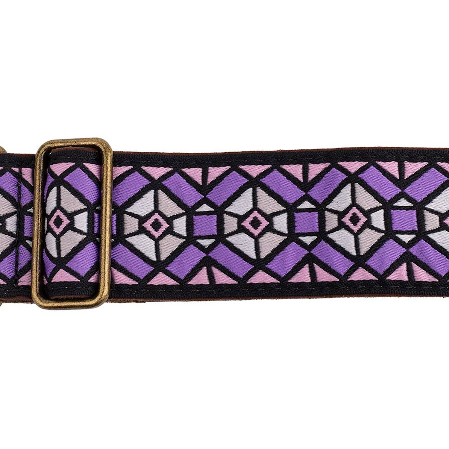 Gitaarband, 2" jacquard geweven, lederen uiteinden met pinnen, messing gesp, suède achterkant, paars/roze