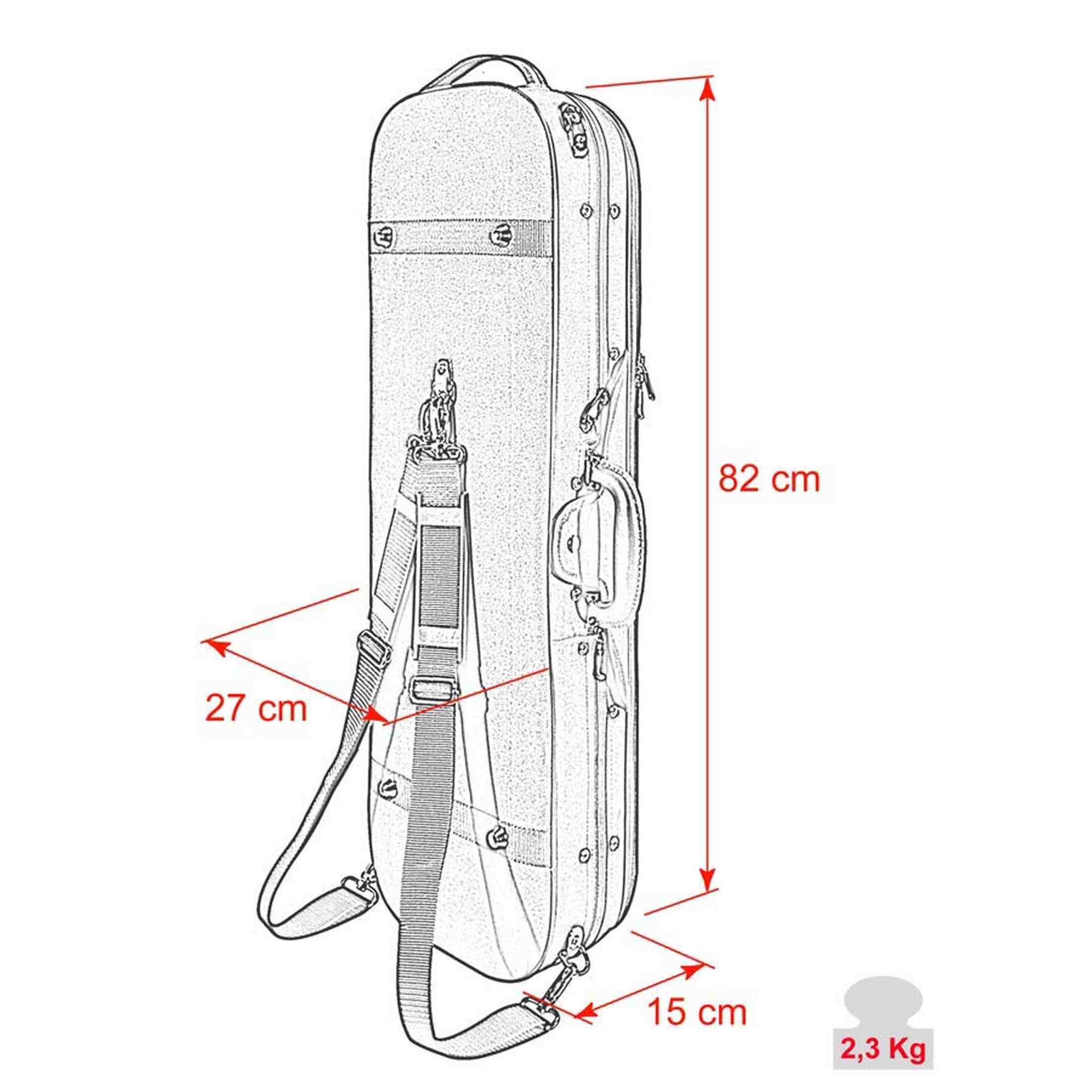 De buitenzijde is afgewerkt met sterke Cordura stof. Binnenin ligt je viool in een blauw suède interieur met beschermdoek. Je neemt twee strijkstokken mee en bergt accessoires op in de twee interne vakken. Met de twee rugriemen draag je de koffer comfortabel naar les, repetitie of orkest.