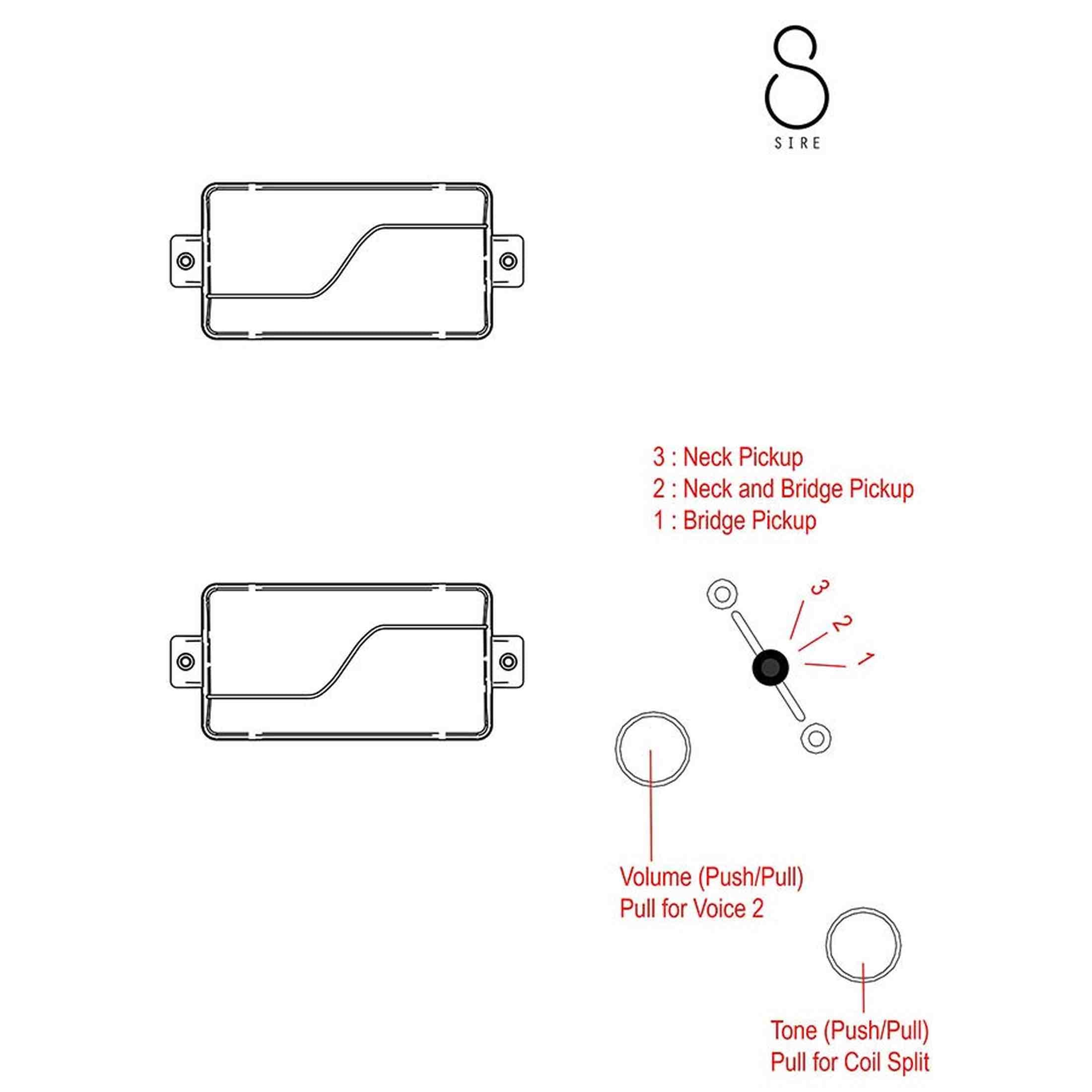 - Bediening: 3-weg schakelaar, volume (push/pull voor Voice 2), toon (push/pull voor coil split)