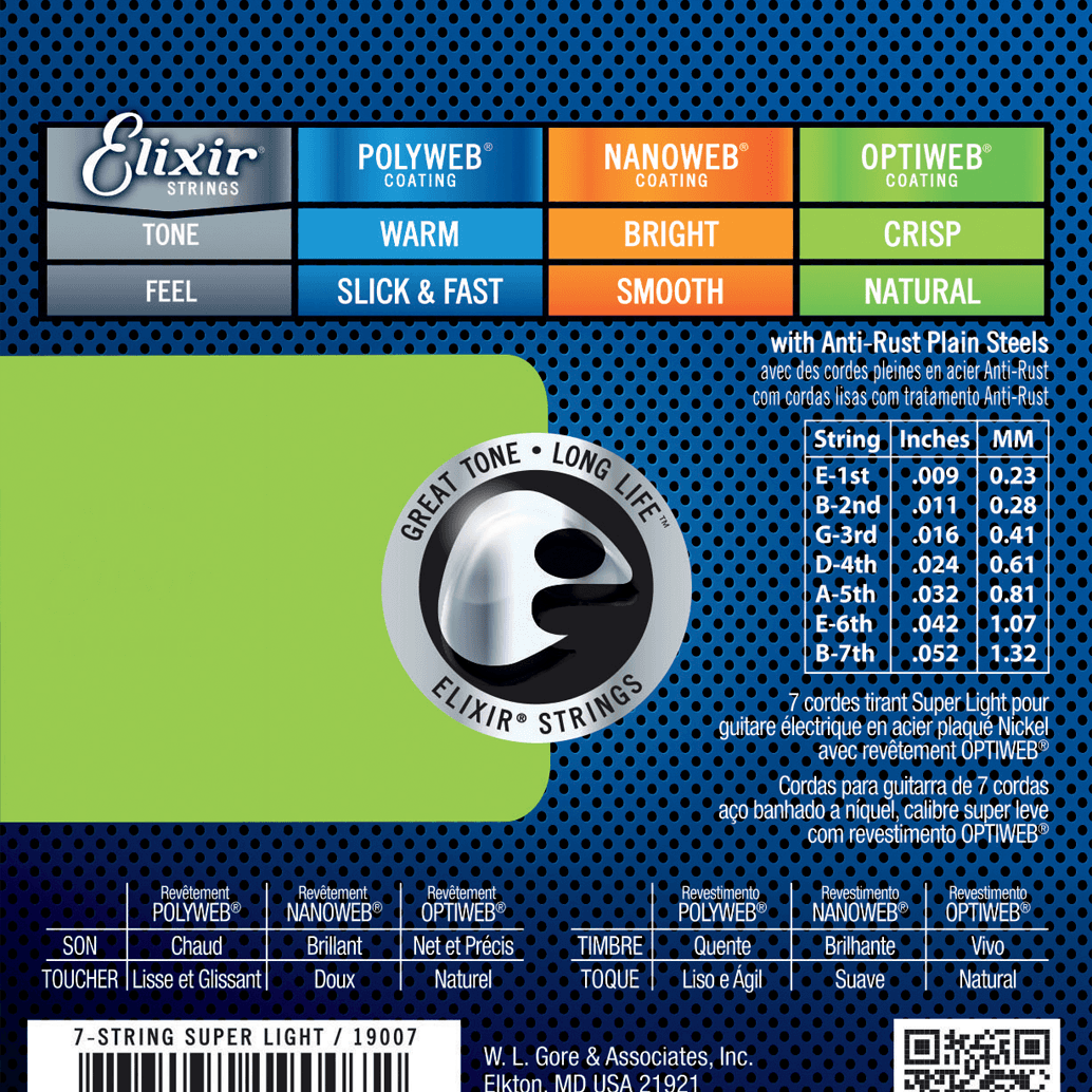 De Elixir 19007 is een set elektrische gitaarsnaren voor 7-snarige gitaren in Super Light uitvoering (009-052), uitgerust met de geavanceerde OPTIWEB® coating. Deze coating biedt het heldere geluid en de natuurlijke feel van een traditionele snaar, maar met de duurzaamheid en bescherming waar Elixir om bekendstaat. Vuil, zweet en corrosie maken geen kans, waardoor de snaren langer helder blijven klinken.