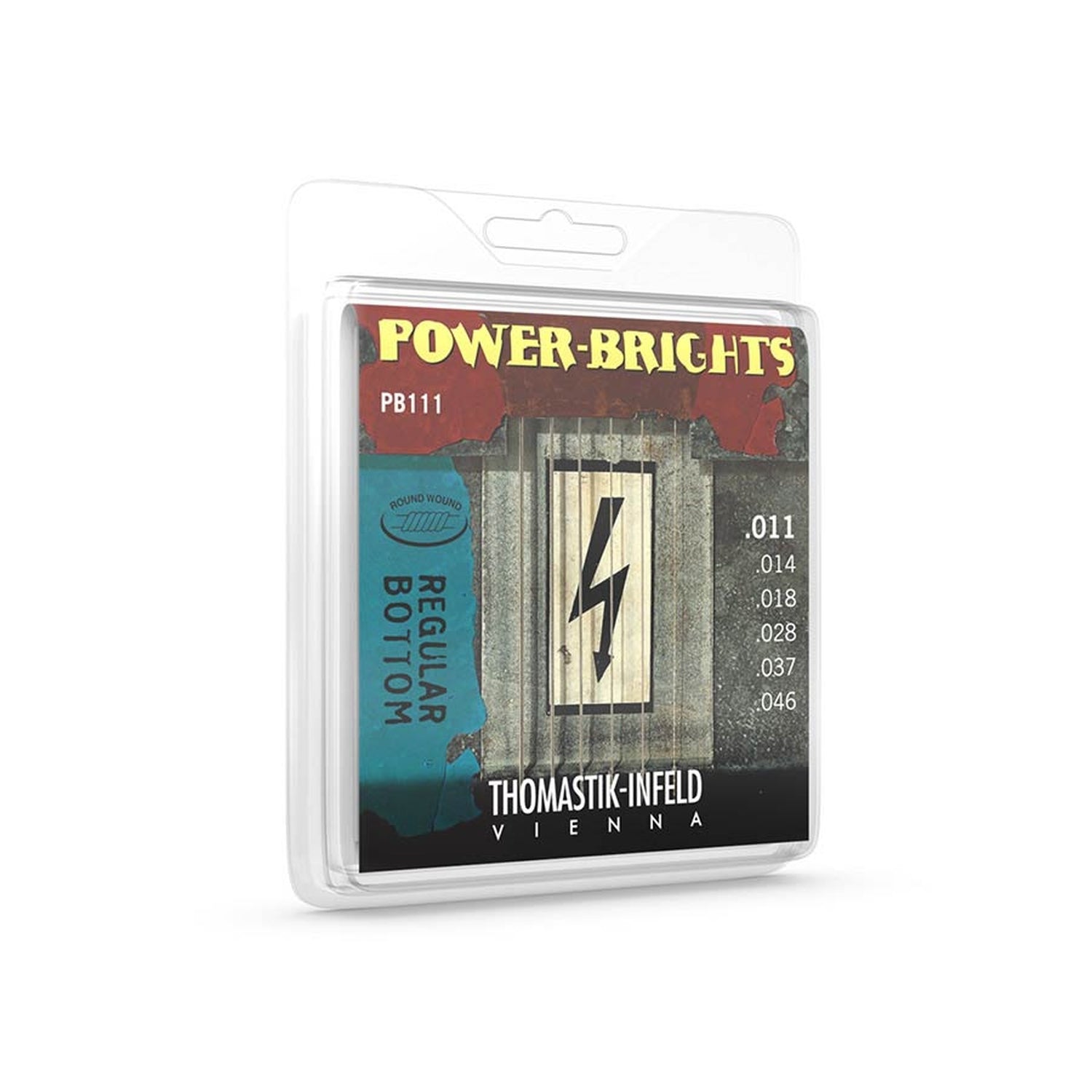 Thomastik Infeld THPB-111 snaren set elektrisch, magnecore, 011-014-018-028-037-046 Roundwound Magnecore alloy on a flexible hexcore for a bright aggressive tone, extra long sustain and reduced playing effort. Designed to enhance harmonics and percussive effects like tapping. High output: POWER-BRIGHTS love distortion!