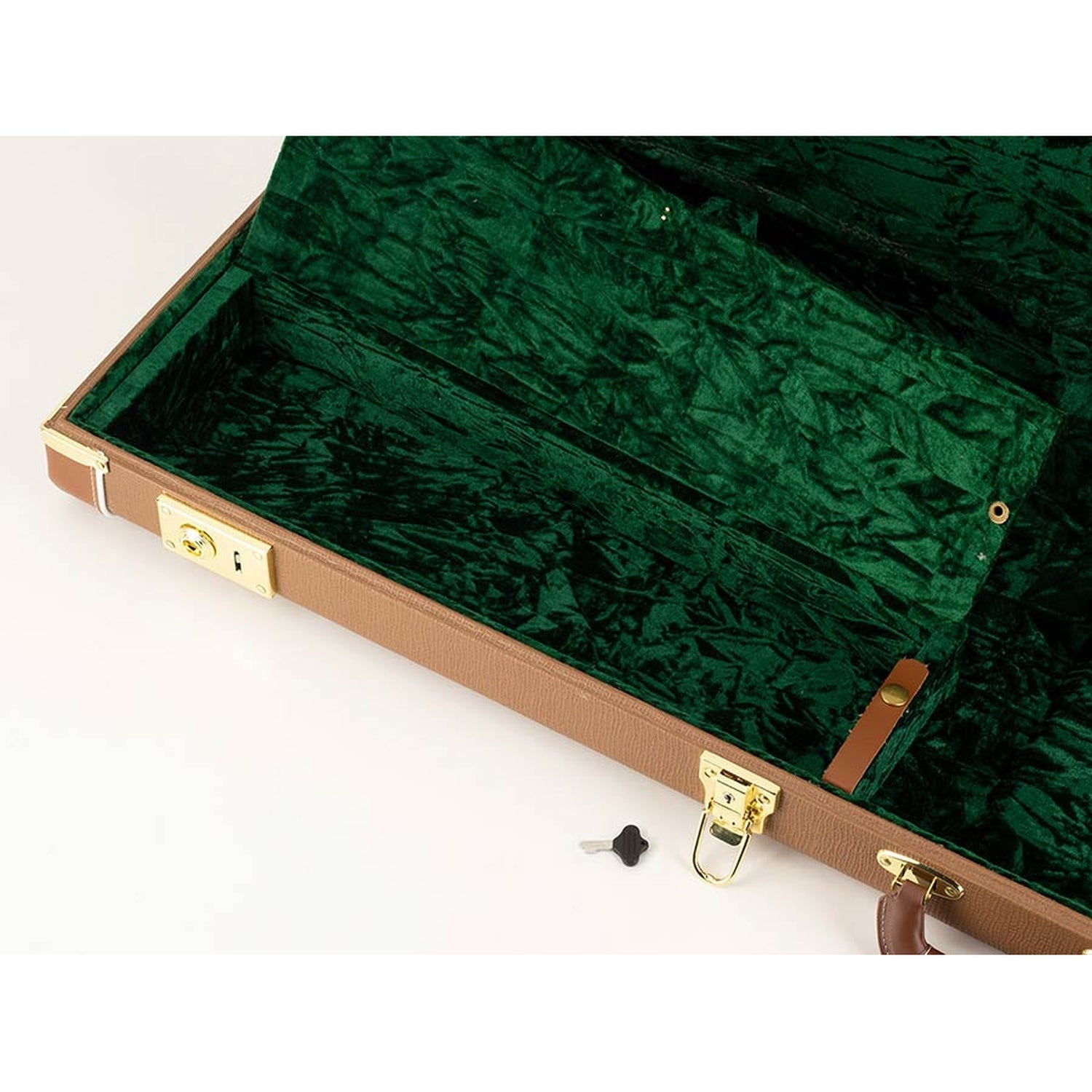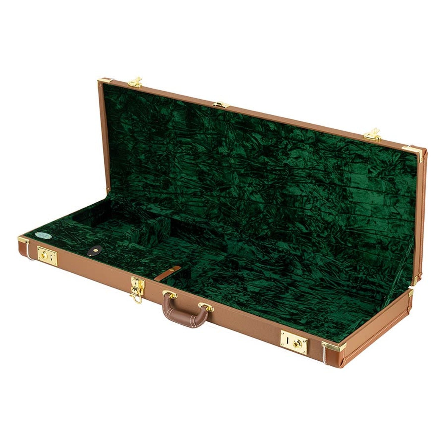 koffer voor elektrische gitaar, bruin tolex, goudkleurige hardware, groen fluwelen interieur