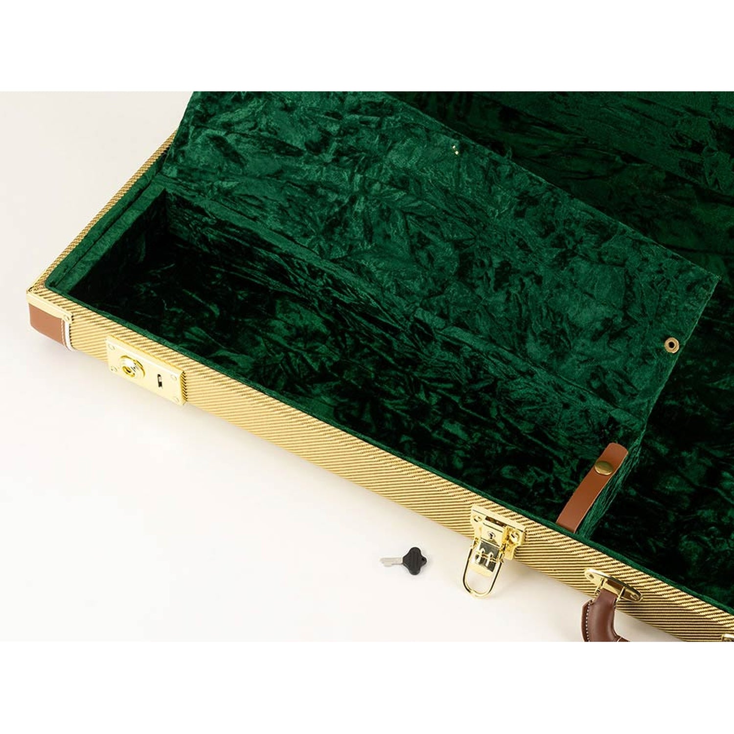 koffer voor elektrische gitaar, vintage tweed, goudkleurige hardware, groen fluwelen interieur