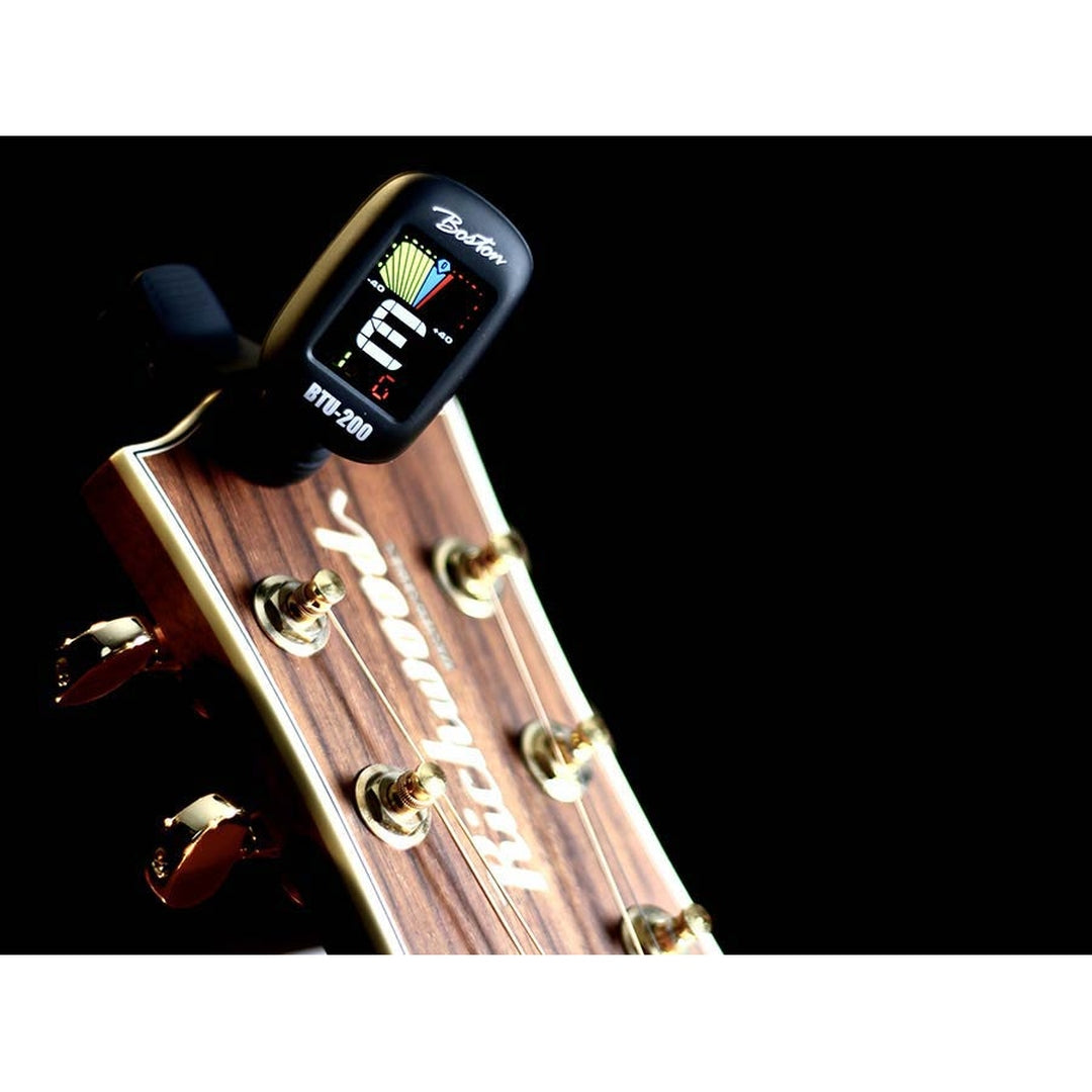 De Boston BTU-200 is een handige clip-on tuner met een full colour display en verschillende modi voor het stemmen: chromatisch, gitaar, bas, viool en ukulele. De laatste geselecteerde modus wordt onthouden voor toekomstig gebruik.